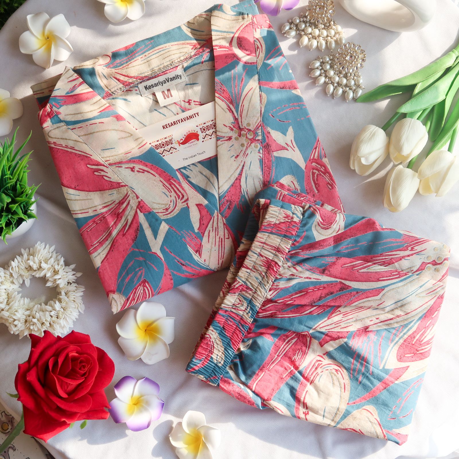 Introducing the “Azure Breeze Harmony Set” – a captivating two-piece cotton ensemble designed to evoke the tranquility of a breezy day. This set is a harmonious blend of cool blue tones, soothing beige hues, and the timeless beauty of leafy florals, creating an ensemble that exudes grace and sophistication.