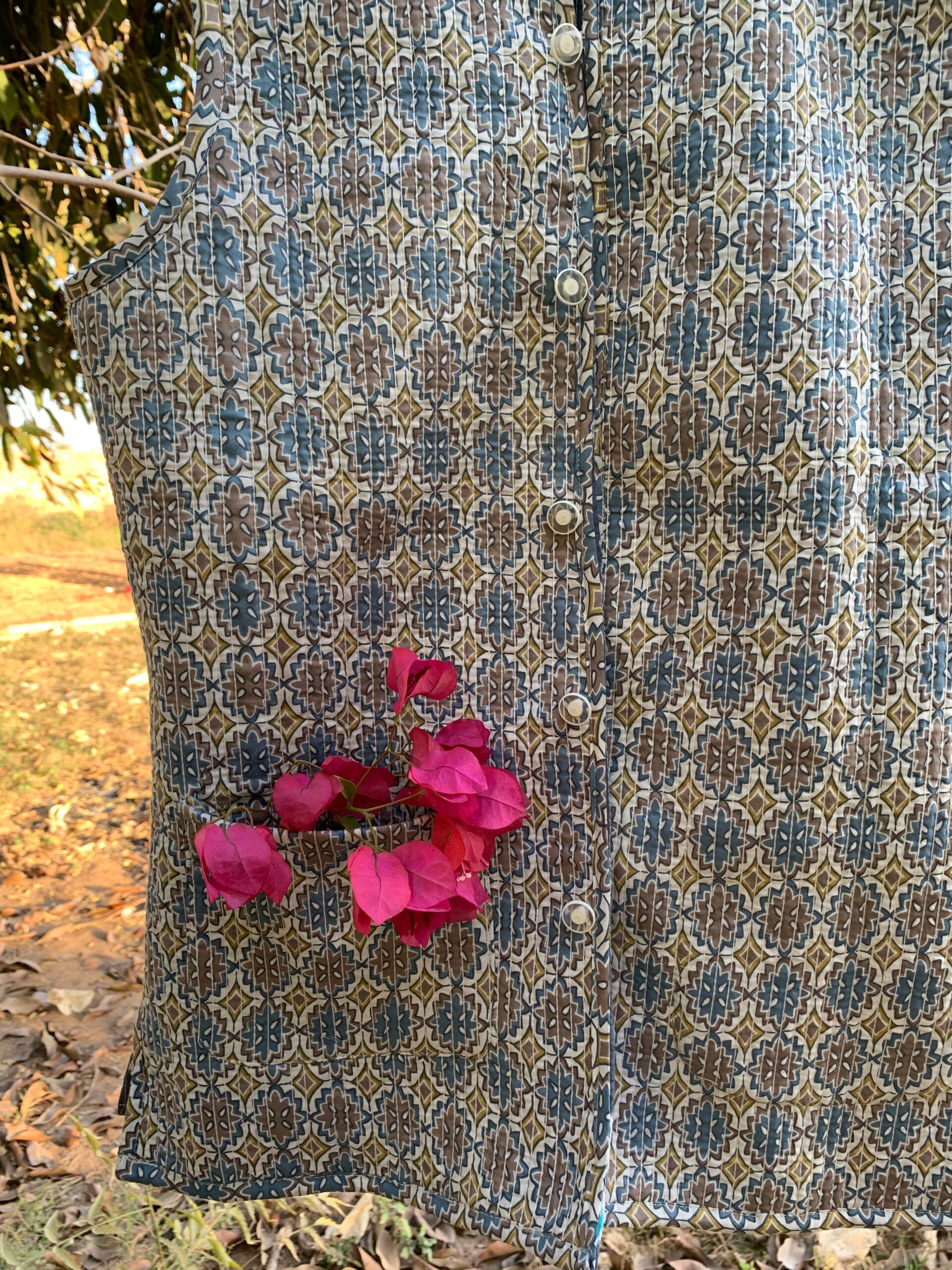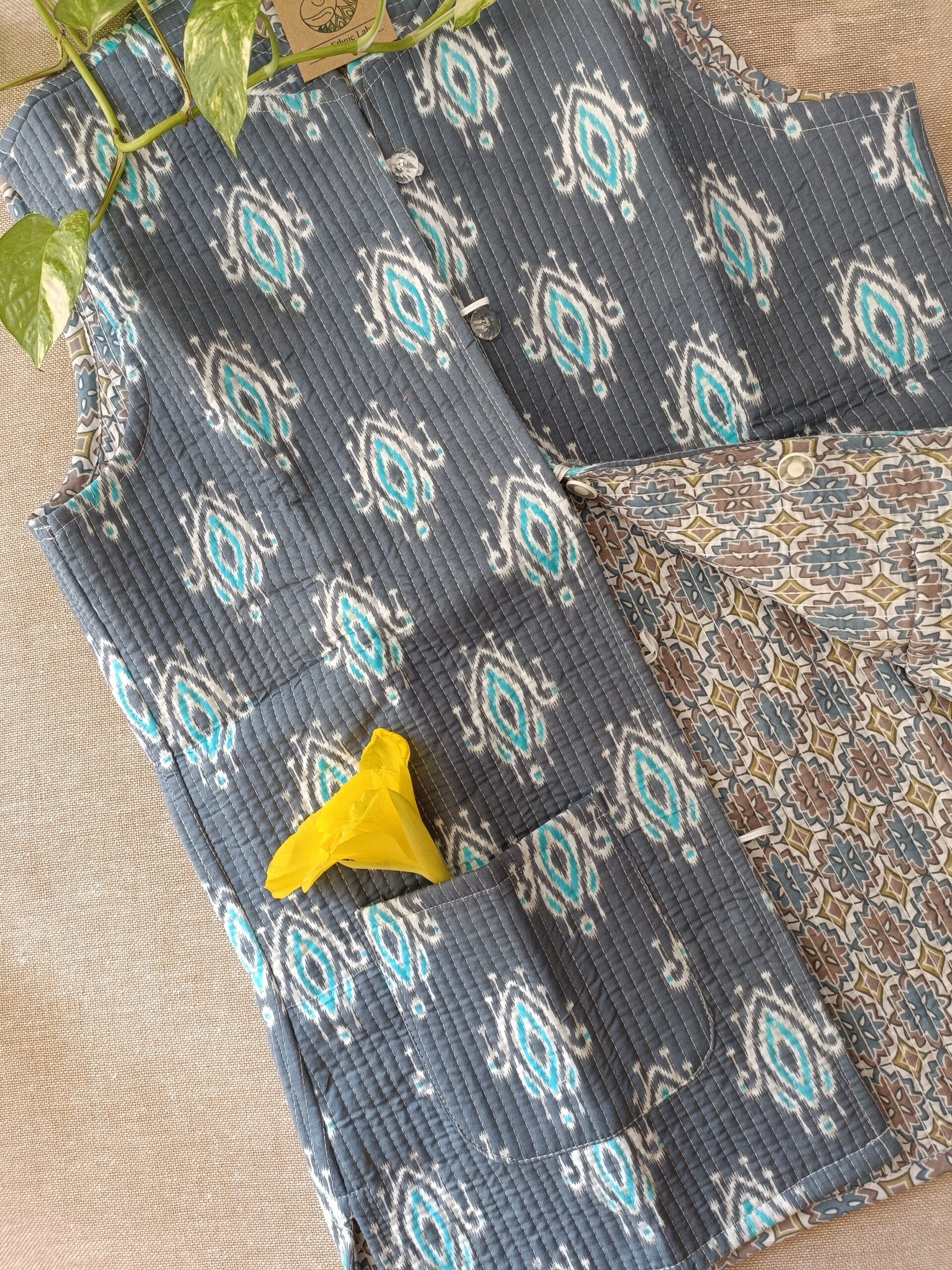 Get this Cozy ,comfortable quilted 2 in 1 half jacket for your everyday winter wear. These quilted jackets have a high necked collar, buttons in front and are reversible. Inspired by the art of hand block printing, this jacket makes you feel royal with its unique print and vibrant colours. This 2 in 1 jacket is surely a bonus purchase for this winter season.