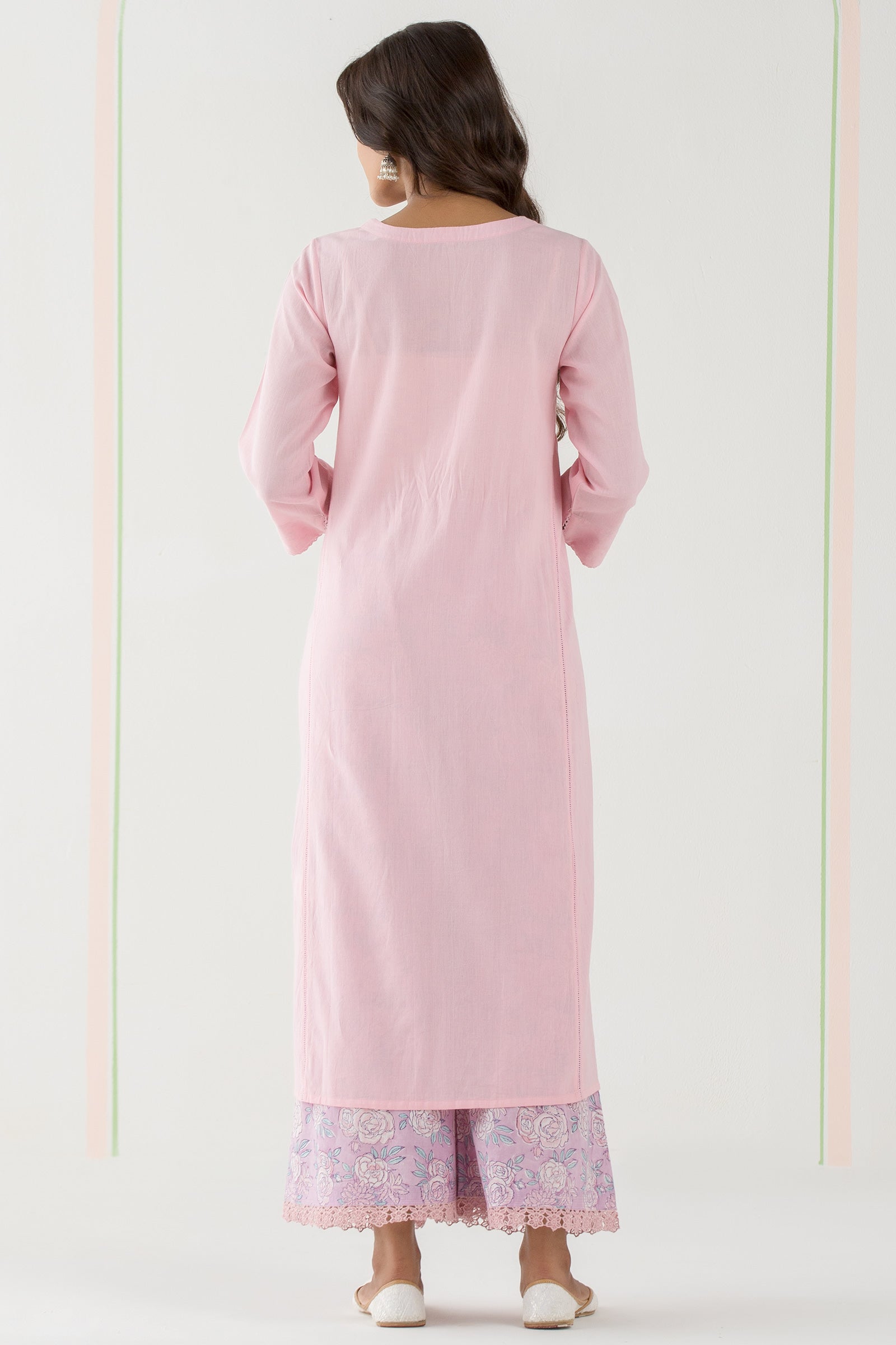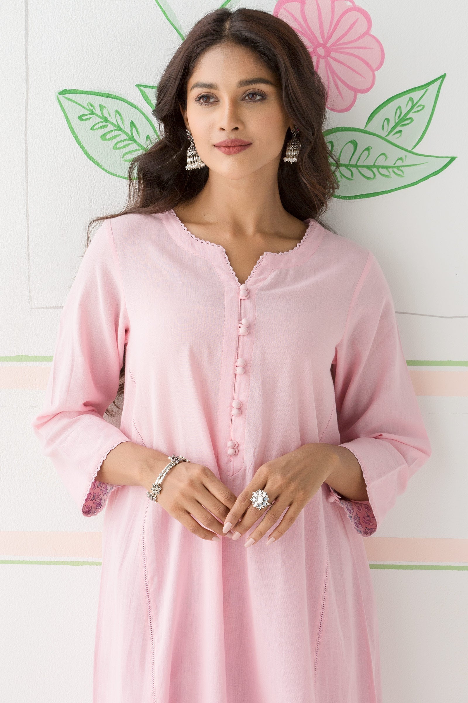 Showcasing a soothing pink shade, the Gulbarg Pink Handloom Kurta exemplifies effortless elegance. Handcrafted in soft Handloom spun Cotton fabric, this breezy Kurta is styled in a classic A-Line silhouette. In terms of embellishments, it features potli button detailing on the neckline and subtle lace detailing on the sleeves and neck. A hand block-printed pattern on the inner side of the cuffs lends it a versatile touch. Wear it with the Gulbarg Zohra Palazzo pants.
