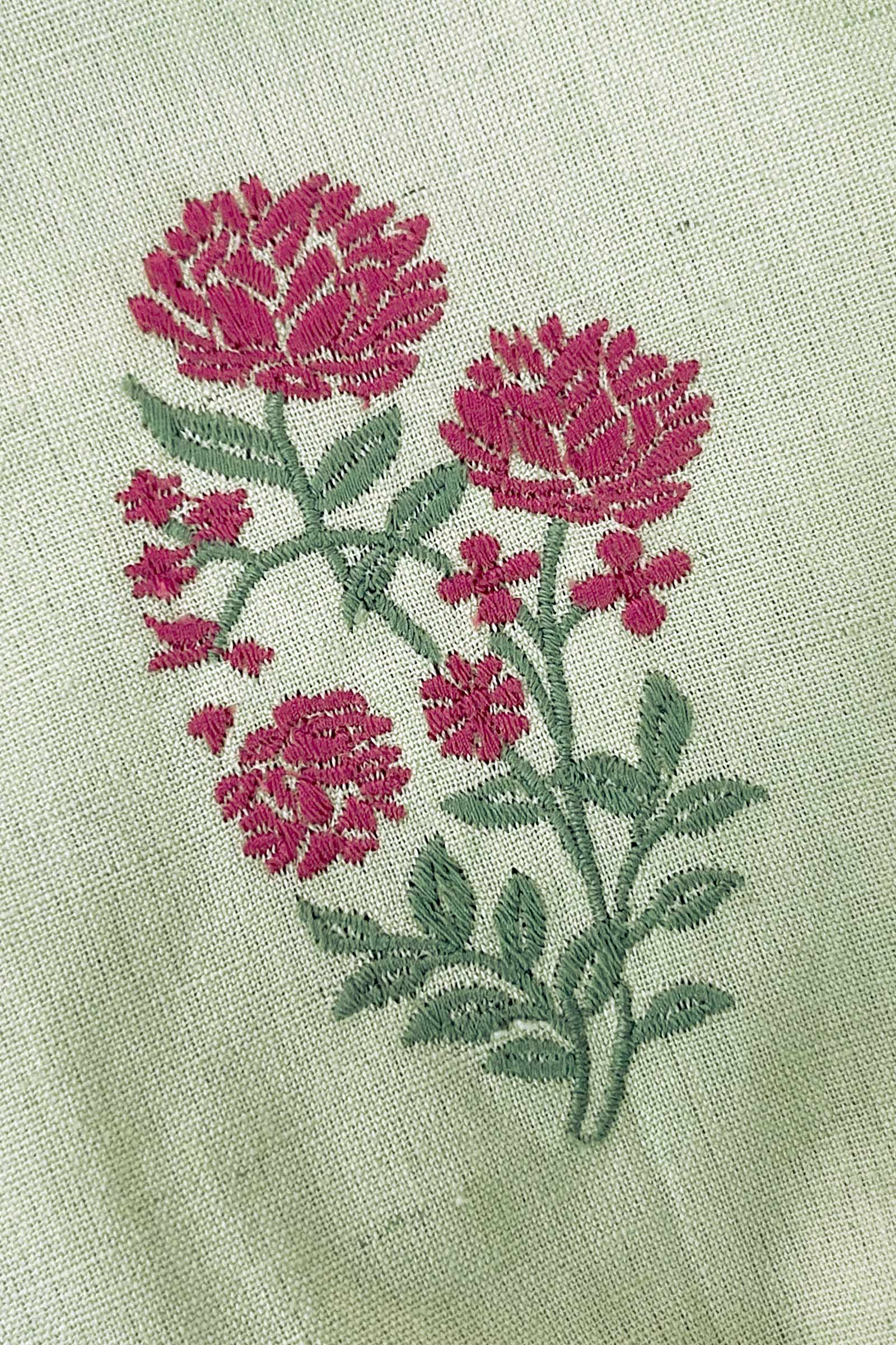 The Nazm Shirin Kurta showcases a soothing green tone. This Straight Kurta is handcrafted in soft Cotton Flax fabric. Precisely embroidered floral motifs running down the front are complemented by the buti pattern on the panels and sleeves. Delicate lace detailing on the neckline and cuffs adds to the charm.
