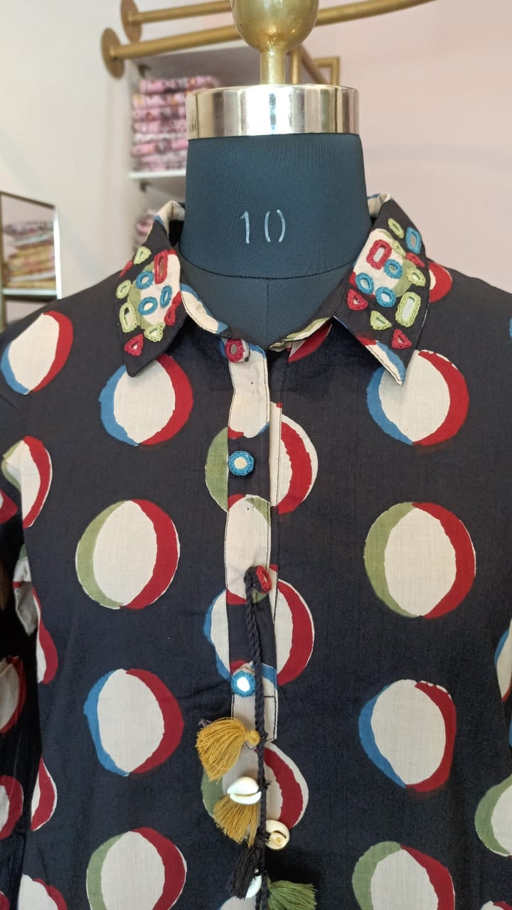 Festive delight, this kurta set is designed for all the days you want to keep things special and festive. This kurta set is a piece of art. The kurta comes with collared neckline and mirror work on cotton fabric. The set contains kurta & pants