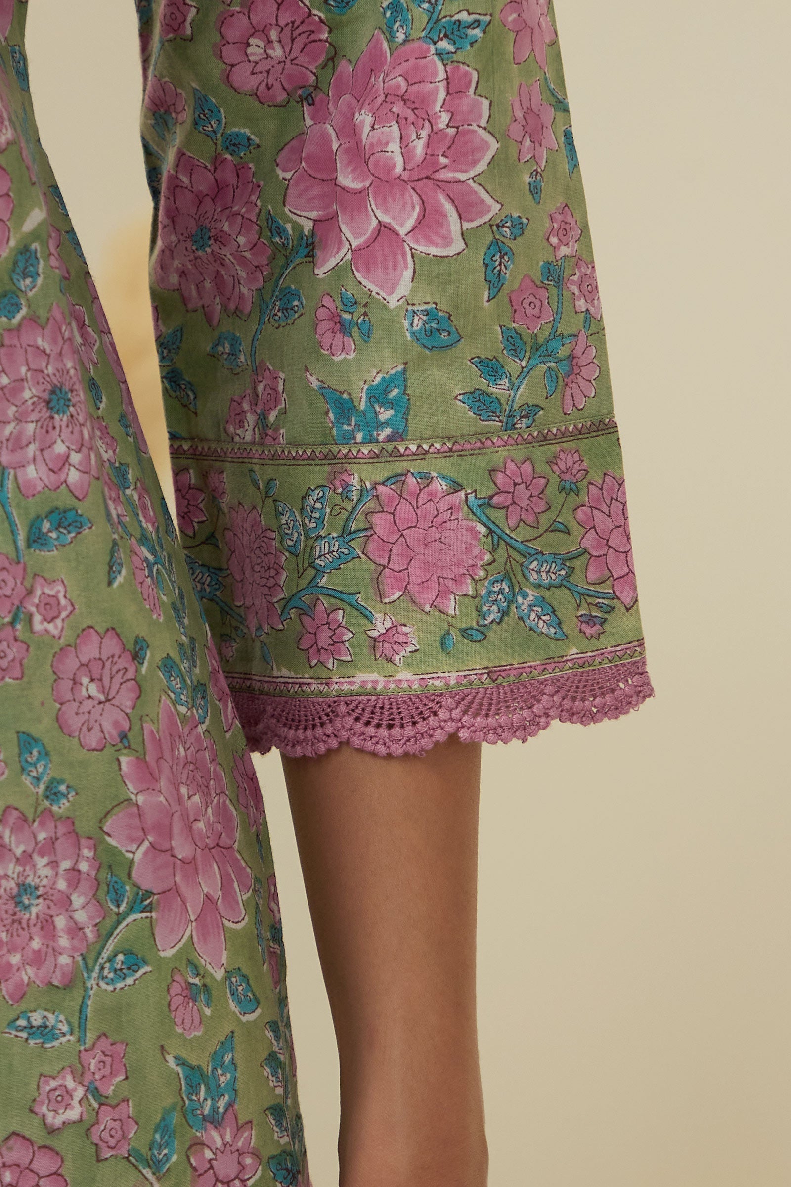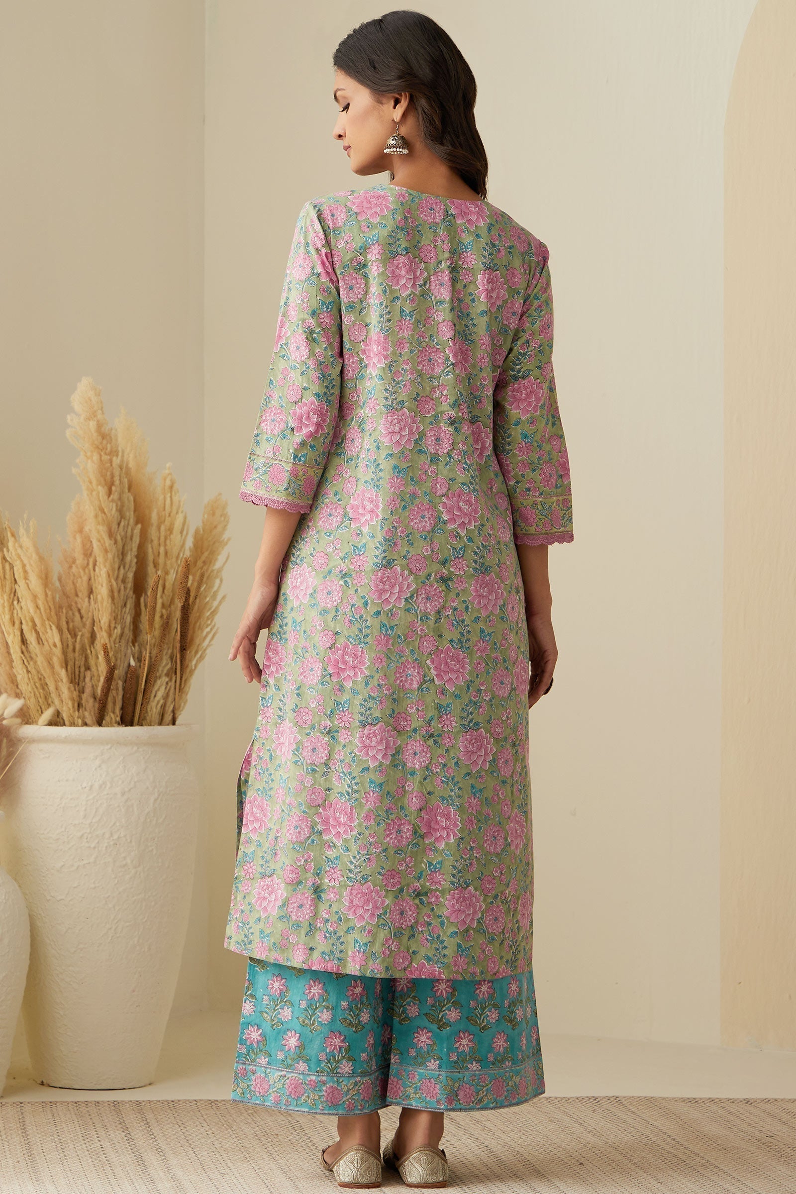 An embodiment of the spirit of Spring, the Rosheen Inara Sanganeri Kurta exhibits a gorgeous green tone. Carefully hand block-printed floral motifs on this Straight Cotton Kurta add a touch of traditional elegance. Delicate lace detailing on the neckline and cuffs adds to the charm.