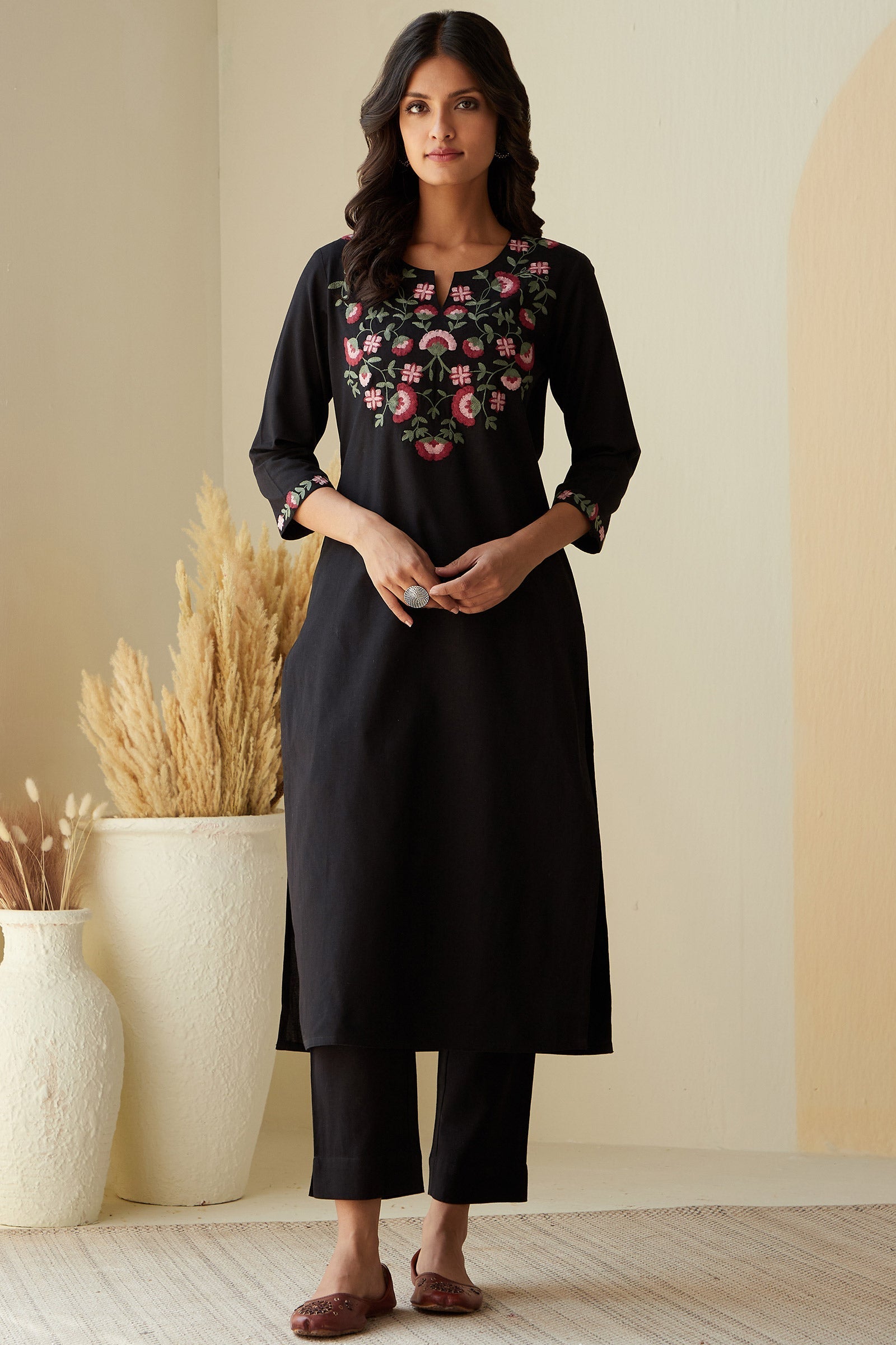 DISCLAIMER: Products printed with the craft involving Ajrak, Bagru, and Akola techniques may bleed during the first few washes or rub against the skin and other light-colored garments. These products may also react to sweat, potentially leading to discoloration over time. Additionally, all hand-printed items naturally tend to lose color with each wash, which is an inherent characteristic of these products. As our items undergo meticulous processes of hand block-printing, embroidery work, and stitching, variations are likely to occur, enhancing the uniqueness of each style. These inherent irregularities are characteristic of all handmade products, providing each piece with a distinct identity.