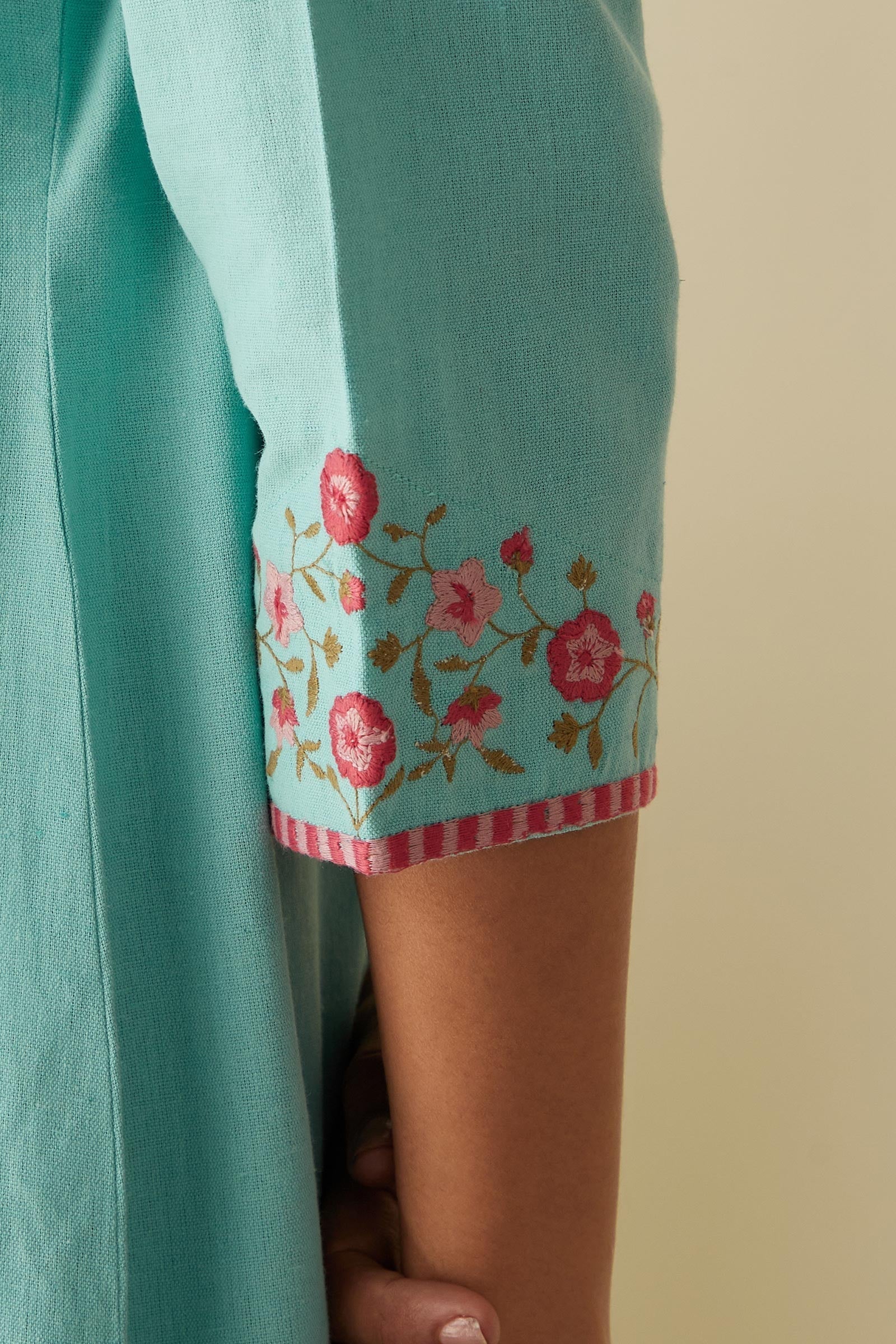 Showcasing a tranquil blue tone, the Rosheen Yasmine Kurta encapsulates the charm of Spring-Summer. Adorned with precisely embroidered floral motifs, this Straight Kurta comes handcrafted in soft Cotton Linen fabric. Pair it with the Rosheen Yasmine Narrow Pants for a complete look.