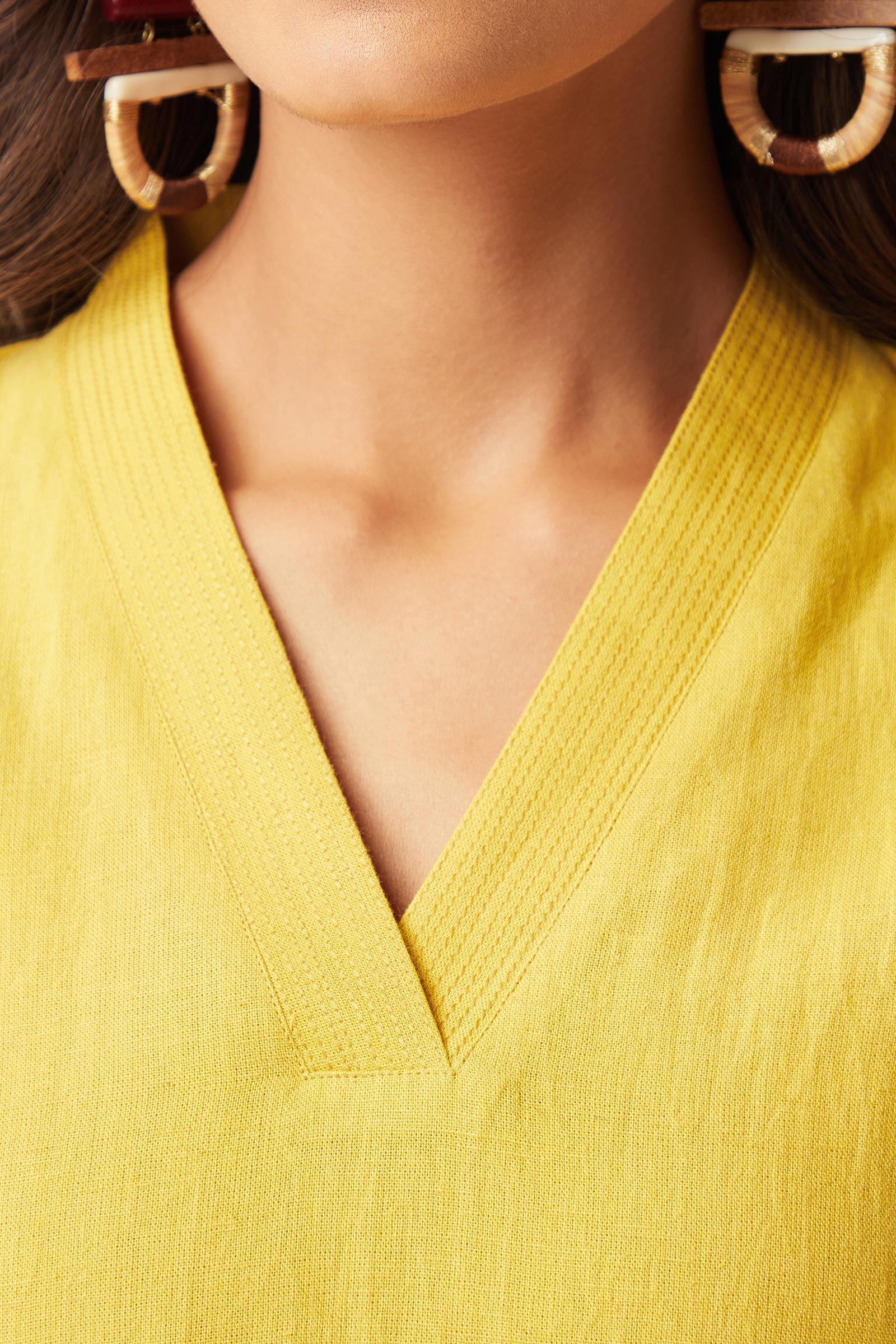 Showcasing the classic charm of monochrome, the Roza Seher Daffodil Kurta exhibits a pleasing yellow tone. Styled in a Straight silhouette, this breezy Kurta comes expertly handcrafted in soft Cotton Linen fabric. For added comfort, it features deep pockets on either side.