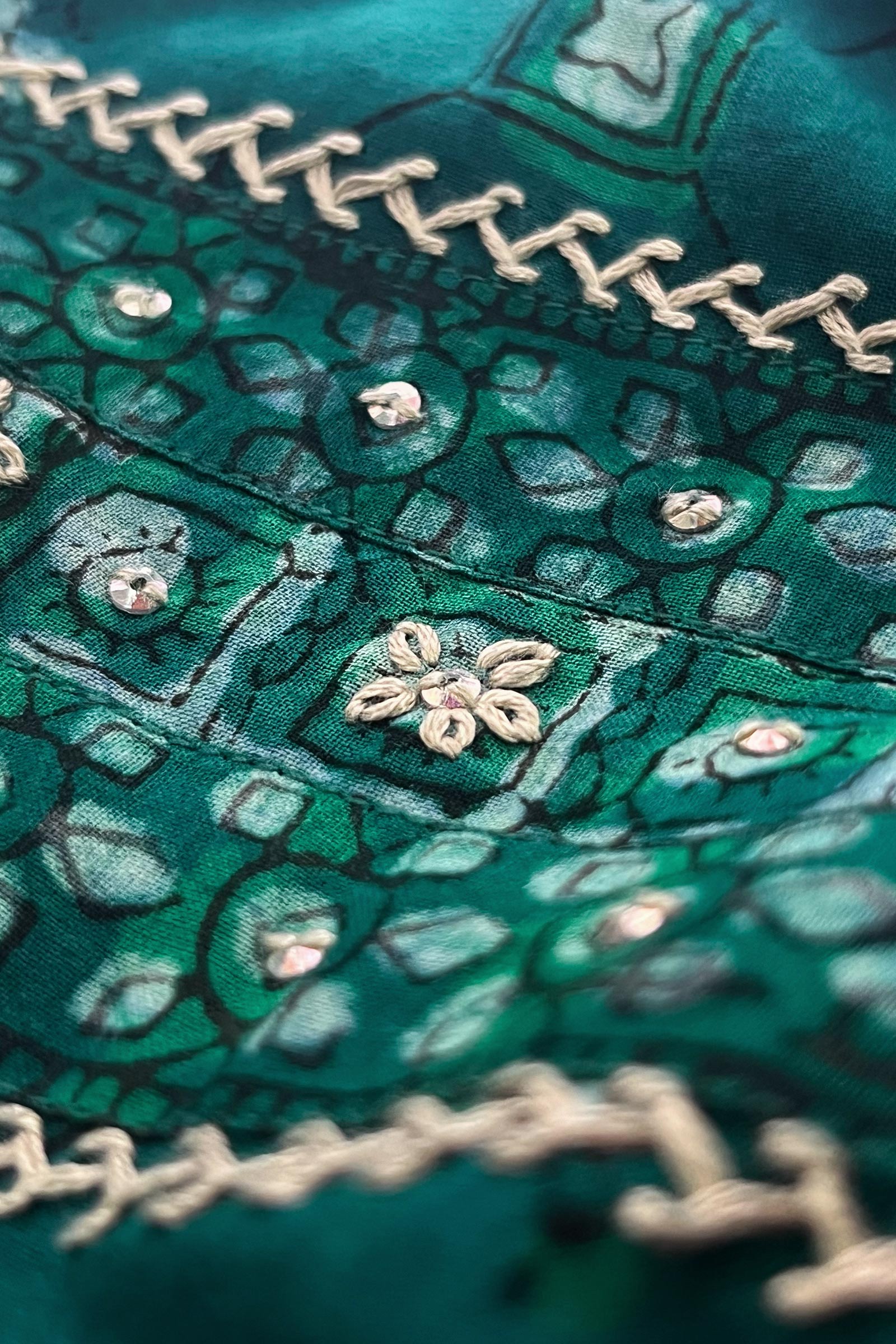 DISCLAIMER: Products printed with the craft involving Ajrak, Bagru, and Akola techniques may bleed during the first few washes or rub against the skin and other light-colored garments. These products may also react to sweat, potentially leading to discoloration over time. Additionally, all hand-printed items naturally tend to lose color with each wash, which is an inherent characteristic of these products. As our items undergo meticulous processes of hand block-printing, embroidery work, and stitching, variations are likely to occur, enhancing the uniqueness of each style. These inherent irregularities are characteristic of all handmade products, providing each piece with a distinct identity.