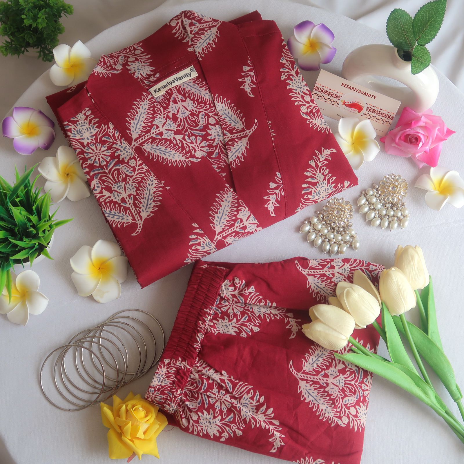 Accompanying the kurta are the matching straight pants, designed with the same captivating rosewood base adorned with the charming floral prints. This coordinated set effortlessly blends comfort and style, making it a versatile choice for both casual outings and special events. Embrace timeless sophistication with this enchanting fusion of contemporary design and classic elegance.
