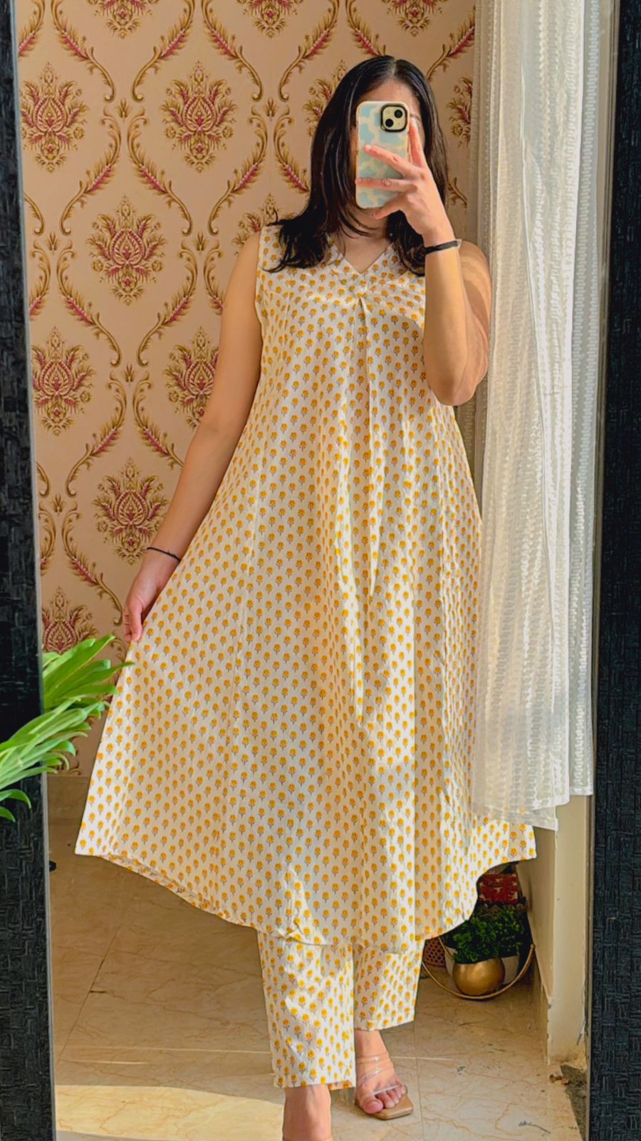 Introducing our charming White Sunshine Cotton Kurta Pants Set, where simplicity meets elegance! The kurta features a pristine white base adorned with delightful yellow small motifs prints, adding a touch of whimsy to your ensemble. Its sleeveless design and classic V-neckline exude modern sophistication, while the A-line pattern ensures a flattering silhouette that drapes beautifully.