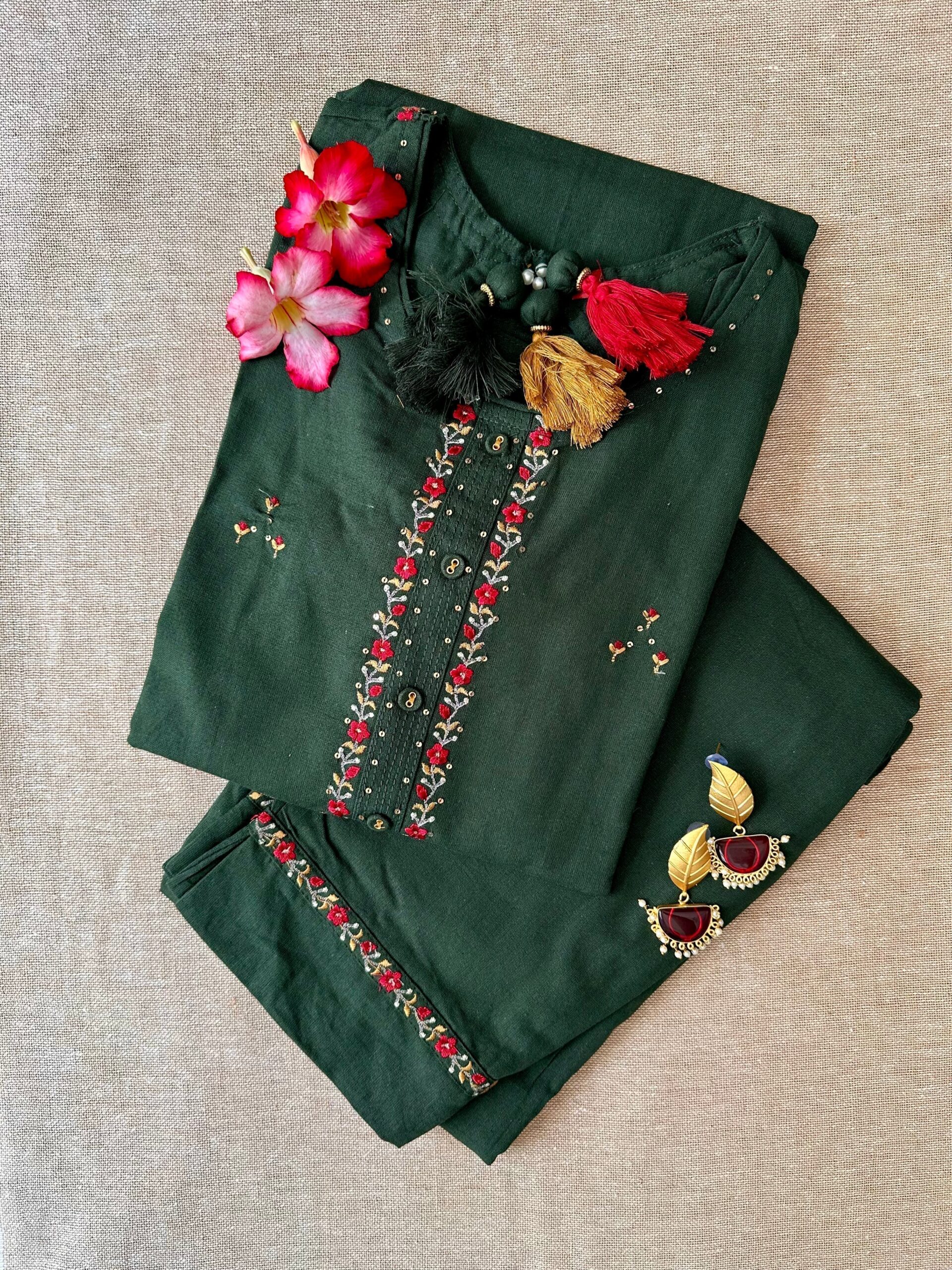 This cotton kurta set is a true representation of lively elegance. The cheerful earthy bottle green hue brings a sense of warmth and positivity to the ensemble, making it a perfect choice for various occasions. The hand embroidery adds an artisanal touch, showcasing intricate patterns that have been skillfully crafted by artisans. The kurta has a very attractive back pattern adorned with tassels. The kurta is paired with straight pants which enhances the grace of the outfit.