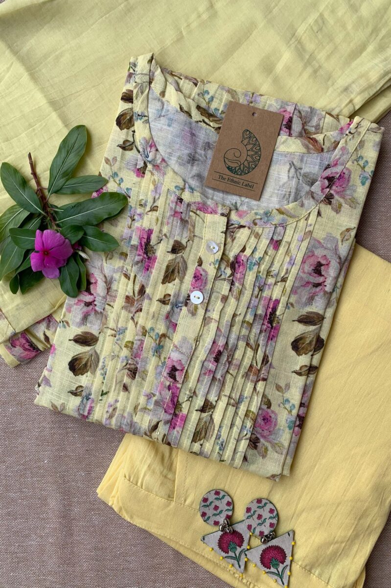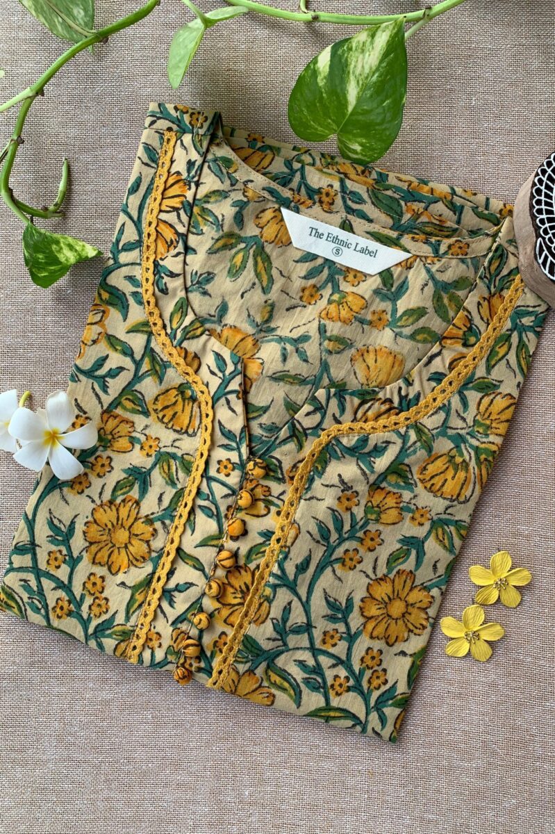 “Flavia” Yellow Sanganeri Hand Block Printed Cotton kurta