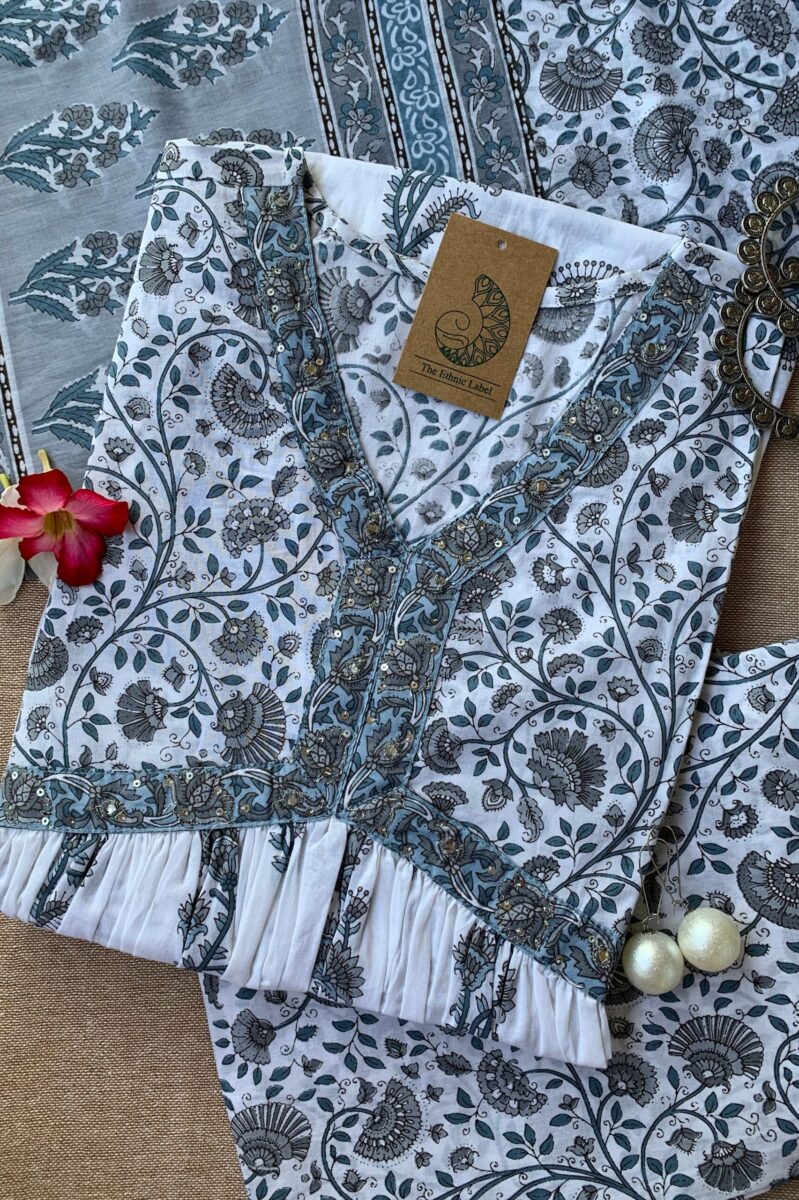 White Grey Mughal Cotton Kurta Set – 3pc