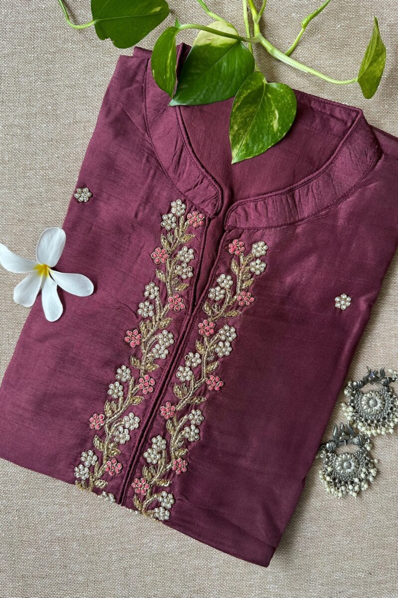 “Meena” Hand Embroidered Wine Silk Kurta