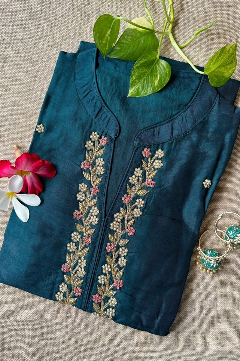“Meena” Hand Embroidered Turquoise Silk Kurta
