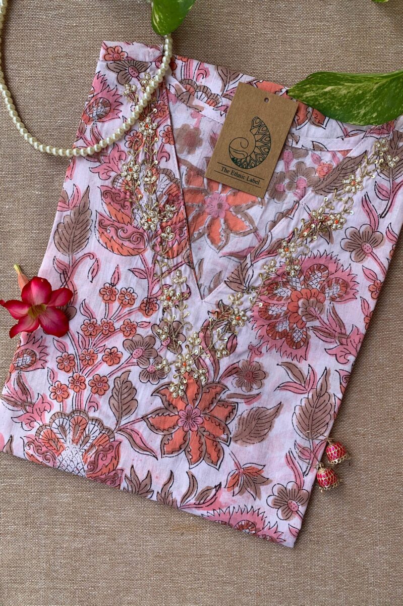 “Peachy Elegance” Hand Work Embellished Cotton kurta